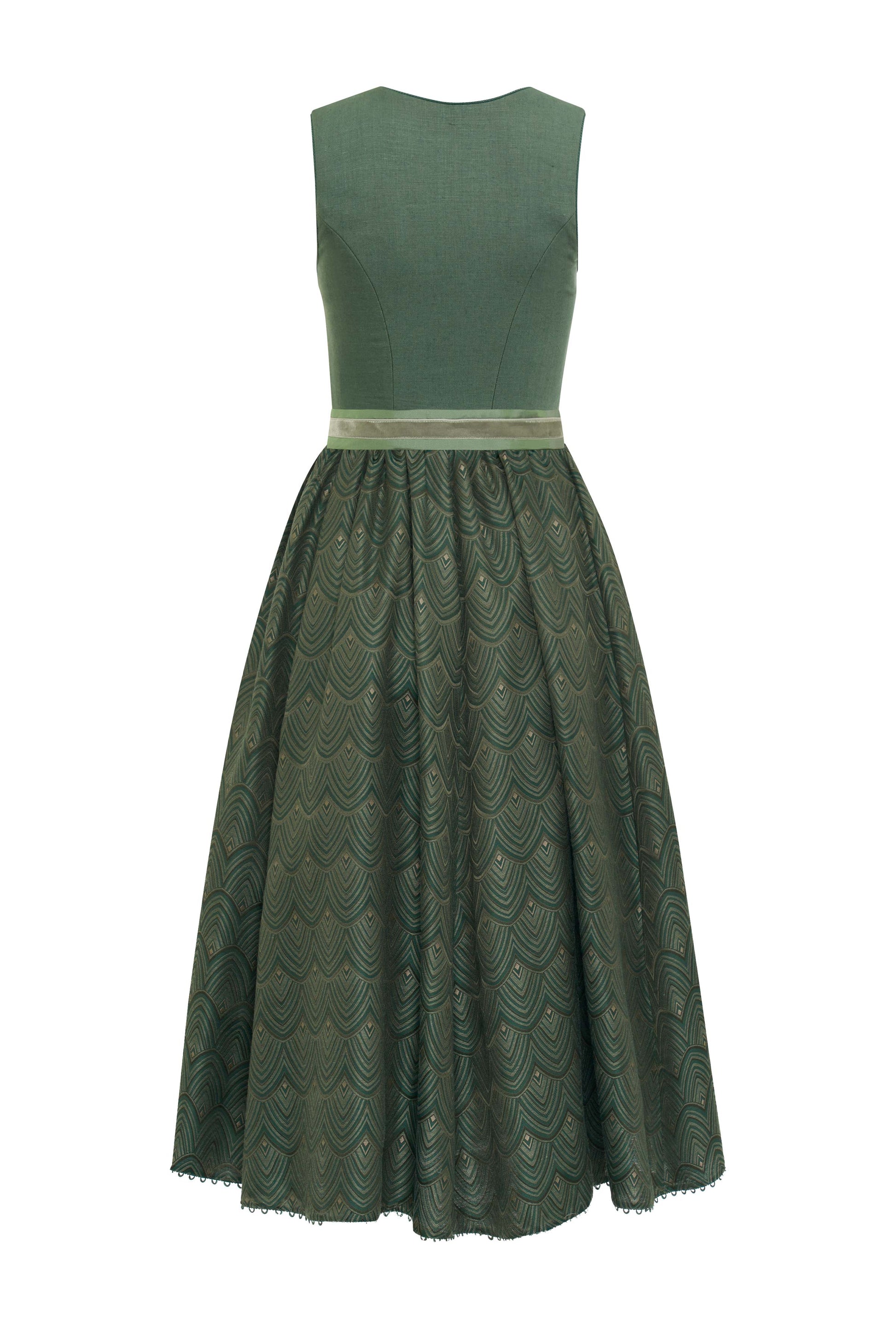 Das Dirndl Almauftrieb in Pinie von Kinga Mathe ist perfekt für traditionelle Anlässe. Der gemusterte Rock und das Leinen Mieder verleihen einen klassischen Look, während die zwei Eingriffsstaschen praktisch für kleine Gegenstände sind. Genießen Sie Komfort und Stil in diesem hochwertigen Dirndl.